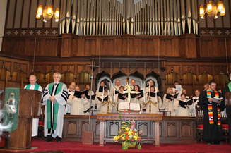 The combined choirs sounded wonderful together. On many of the musical offerings the organ, played by Alan Kimbrough, was accompanied by piano. Holy Communion went well with different stations for wine and grape juice without too much confusion. My sermon was well received even though the Baptists are used to longer homilies than we are. Sermon